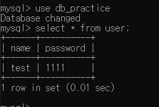 import java.sql.*; public class Practice1 { public static void main(String[] args) { Connection conn = null; String dbURL = "jdbc:mysql://localhost:3306/db_practice?serverTimezone=Asia/Seoul&useSSL=false&useUnicode=true&characterEncoding=utf8"; PreparedStatement pstmt; ResultSet rs; String dbID = "root"; String dbPassword = "mysql초기 설정시 비밀번호"; try { //드라이버 로딩 Class.forName("com.mysql.jdbc.Driver"); //Connection생성 conn = DriverManager.getConnection(dbURL, dbID, dbPassword); }catch (Exception e){ e.printStackTrace(); } //데이터를 INSERT String SQL = "INSERT INTO USER VALUES (?, ?)"; try { pstmt = conn.prepareStatement(SQL); pstmt.setString(1, "test"); pstmt.setString(2, "1111"); pstmt.executeUpdate(); }catch (Exception e){ e.printStackTrace(); } } }